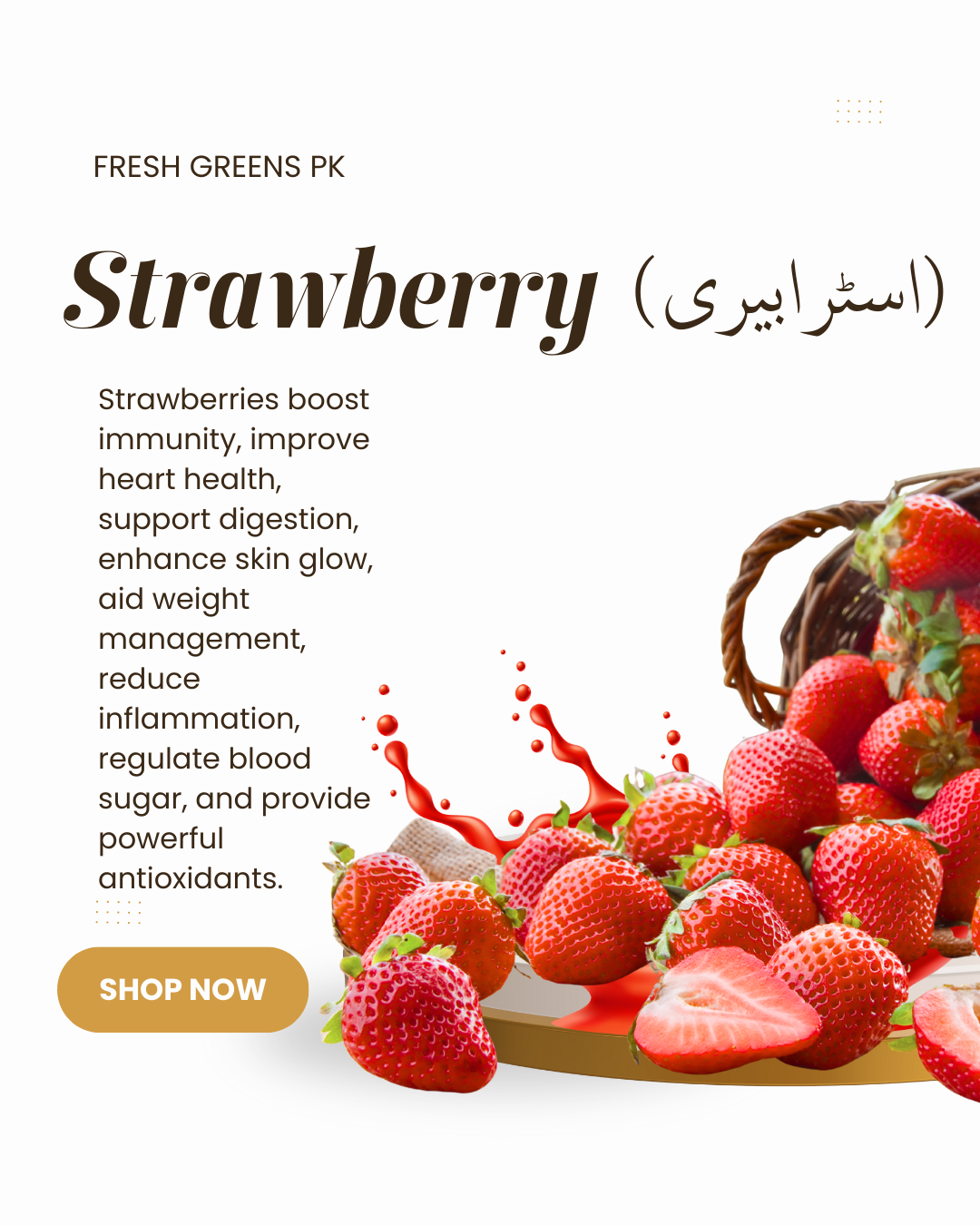 “Fresh Green PK Strawberry (اسٹرابیری) – rich in vitamin C, antioxidants, and fiber to boost immunity and support heart health.”